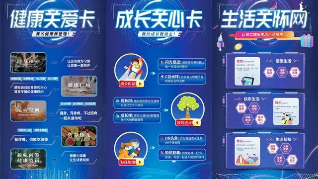 兩卡一網”是利用雲計算等技術,為員工的身心健康、職業成長和便捷生活構建“兩卡一網”智慧服務雲平台。“兩卡一網”包括“員工健康關愛卡”“員工成長關心卡”和“員工生活關懷網”。其中,“員工健康關愛卡”通過體檢檔案管理、運動打卡積分、營養指導等為員工提供個性化健康指導,係統管理身心狀態;“員工成長關心卡”通過閃光足跡、成長樹、HR頭條等記錄員工職業成長曆程,幫助員工明晰職業生涯發展方向;“員工生活關懷網”以品質生活為始點,通過特惠商超、線上菜籃子工程、協會趣吧、困難幫扶等,讓員工生活更加便捷、更加實惠、更加快樂。